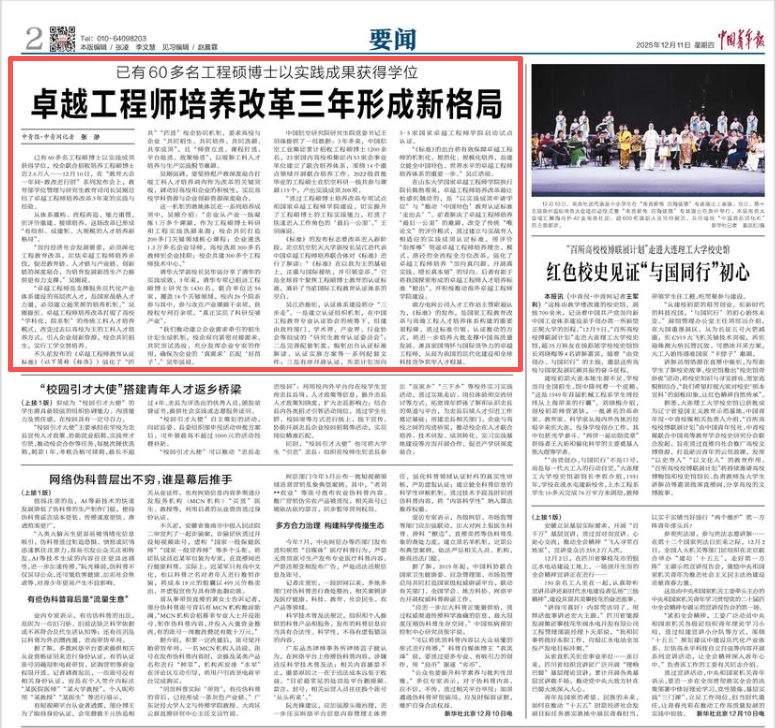 2021年召开的中央人才工作会议把“培养大批卓越工程师”作为“加快建设国家战略人才力量”的重要内容。2022年起,中组部、教育部等9部门启动工程硕博士培养改革专项试点。今年12月4日,卓越工程师培养改革座谈会召开,会议强调要深化工程教育改革、加大卓越工程师培养力度,为建设教育强国、科技强国、人才强国提供有力支撑。