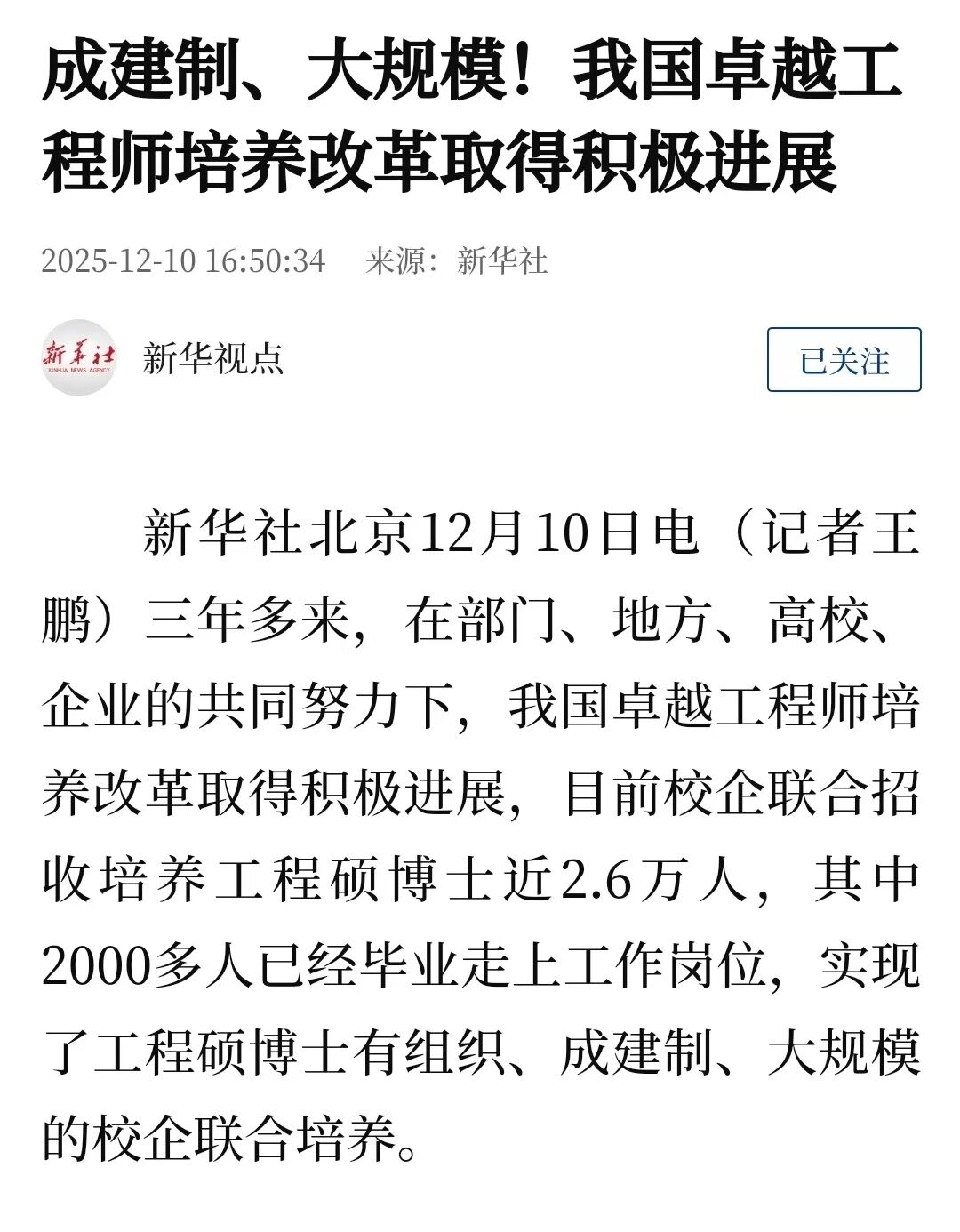 记者了解到,3年多来,在部门、地方、高校、企业的共同努力下,我国卓越工程师培养改革取得积极进展,目前校企联合招收培养工程硕博士近2.6万人,其中2000多人已经毕业走上工作岗位,实现了工程硕博士有组织、成建制、大规模的校企联合培养。